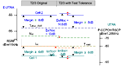 During T1 (Cell 2 RSRP – Tother_RAT) is -8dB, just meeting the margin of at least -8dB. The Noc of cell 2 is therefore decreased by the Cell 2 RSRP uncertainty. Additionally decreased by the Ês/Noc uncertainty is not needed due to the minimum Cell 2 Ês/Iot is -3.33dB take into account of it’s uncertainty, it is bigger than the condition of Ês/Iot -4 dB in TS 36.133.