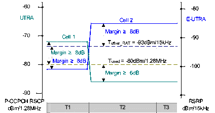 During T1, the signal (RSCP) of Cell 1 is set to be above Tused with a margin of 8dB, just meeting the margin of at least 8dB. To maintain the 8dB margin, Ior/Ioc of cell 1 is increased by the Ioc reduction, and additionally increased by the Cell 1 RSCP uncertainty.